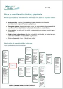 Mikäli työpaikalla ei vielä ole toimintamallia uhka- ja vaaratilanteiden hallintaan, pohjana voi hyödyntää METO:n koostamaa mallia. Löydät sen Metsähyvinvoinnin aineistopankista. Lisätietoa löytyy myös sivustolta tyosuojelu.fi.